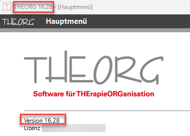 Welche THEORG-Version Sie aktuell installiert haben, sehen Sie im THEORG {Hauptmenü} ganz oben links oder auch unterhalb Ihrer Lizenznummer: