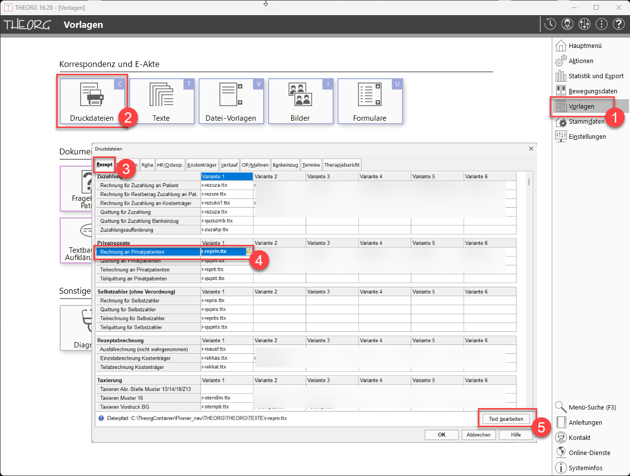 Hinweis: Bearbeiten Sie alle Rechnungstexte, die Sie nutzen! Das sind in den {Druckdateien} Lasche {Rezept} verschiedene Rechnungstexte, die Rezepte betreffen (Privatrechnung, Rechnungen für Zuzahlungen, Zuzahlungsaufforderung). In den {Druckdateien} Lasche {Verkauf} können Sie die Rechnungstexte für die Ausfallrechnung und für den Verkauf bearbeiten.