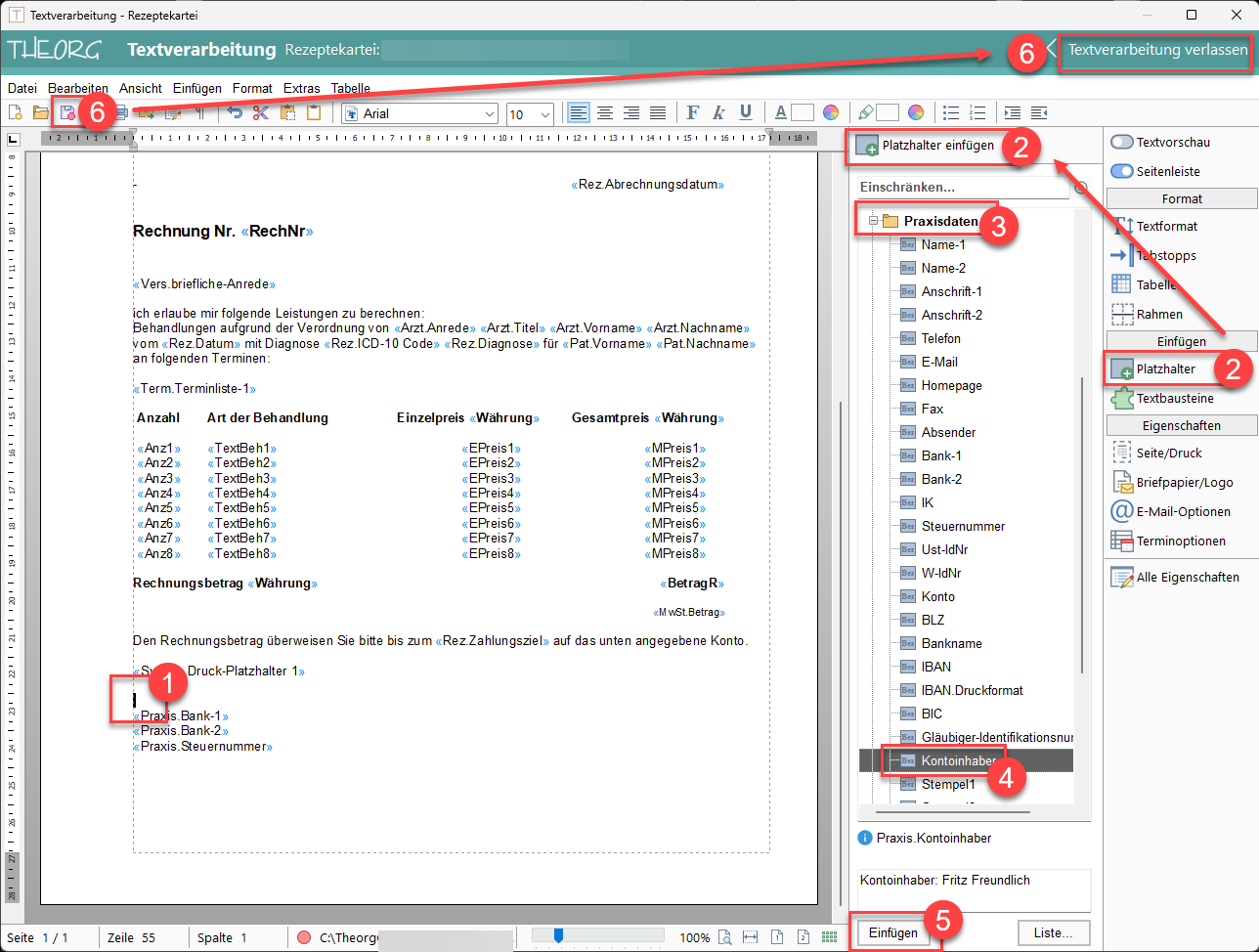 Um in einer Rechnungsvorlage einen zusätzlichen Platzhalter einzufügen, gehen Sie folgende Schritte der Reihe nach durch: