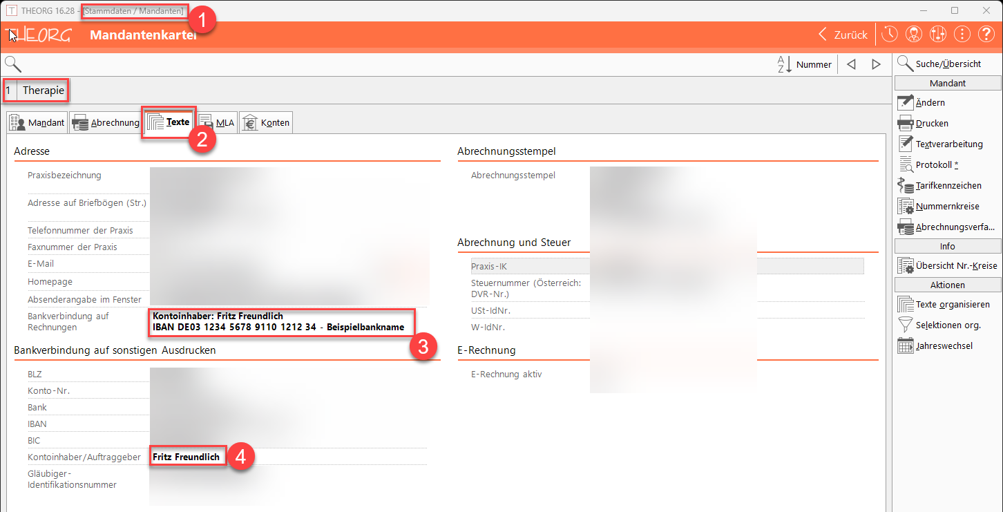 Wenn Sie in THEORG zusätzlich zur Bankverbindung auch den Kontoinhaber auf der Rechnung ergänzen möchten, so klären Sie bitte im Vorfeld mit ihrer Bank was Sie als „Empfängername“ für ihr Konto hinterlegt haben.