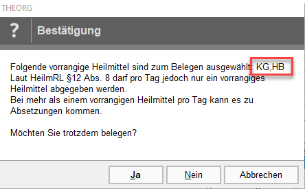 THEORG überprüft bereits bei der Terminbelegung, welche Heilmittel kombiniert belegt werden können und warnt, falls es Probleme geben könnte.